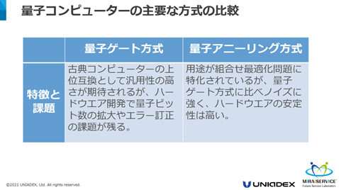 量子コンピューターには現在大きく二つの方式があります。一つは量子ゲート方式と言われるもので、古典コンピューターと同様の汎用性があるものです。もう一つが量子アニーリング方式で、組み合わせ最適化問題*を解くことに特化しています。