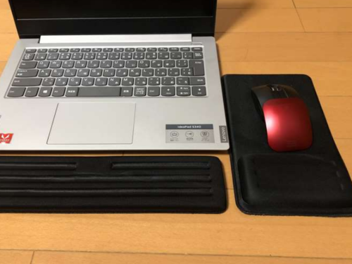 手にマウスだこを飼育してしまいやすい私は、低反発クッション付きのリストレストを使用して手にたこを飼育せず、快適に仕事しています。写真は100円ショップで購入した「低反発リストレスト(左下)」、「低反発マウスパッド(右)」です。安価で、テレワーク環境を快適に過ごすためのツールとしておすすめです。』