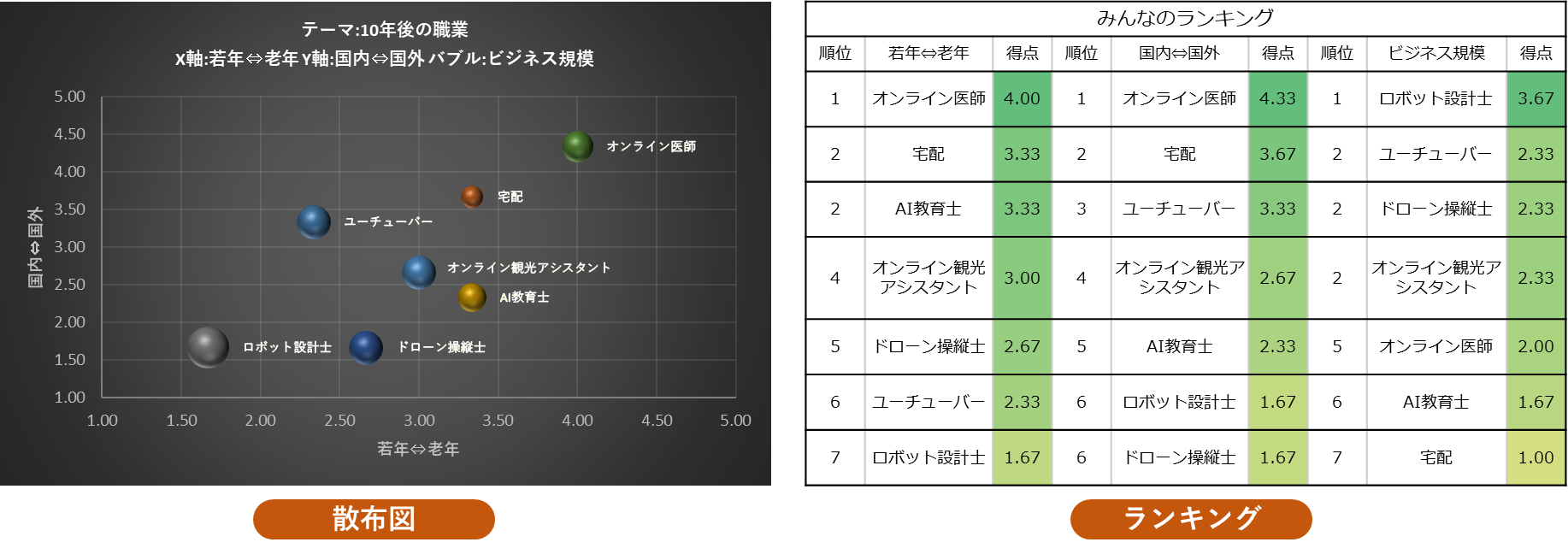 そこで未来研では、未来飛考コンパスという独自ツールを作成しました。このツールに「アイデア」と「アイデアを評価するための軸」を設定し、評点付けを行うことでアイデアを二次元上にプロットすることができます。こうすることで各アイデアの特徴や重要度を直感的に理解することができます。