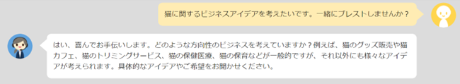 まずはアイデア出しの定番であるブレストに誘ってみます!テーマは筆者の好きな「猫」ビジネスです!