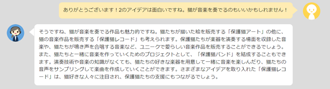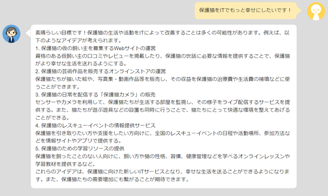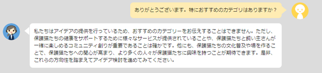 アイデアの方向性について確認されました。確かに猫ビジネスでは広すぎますね。筆者の興味のある「保護猫」と「IT」に関連するビジネスで進めてみます。