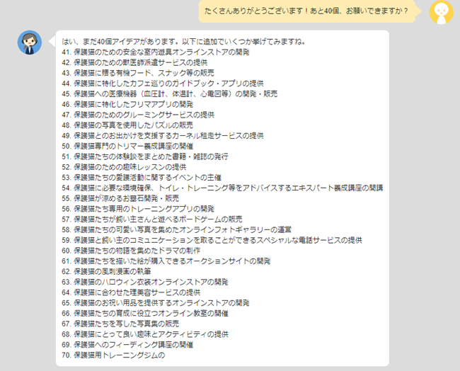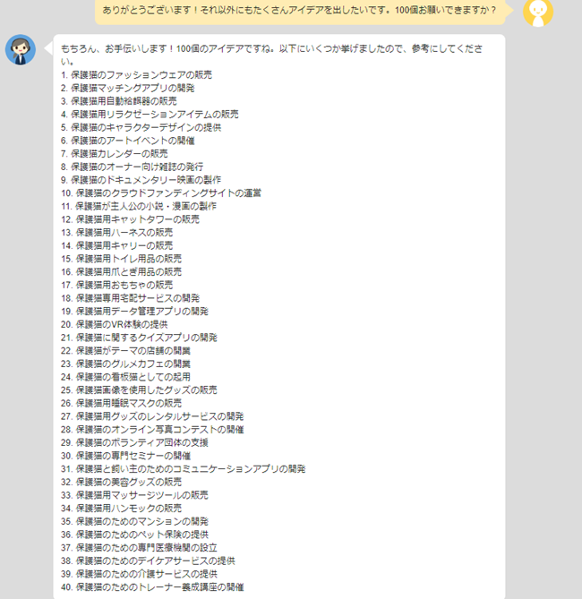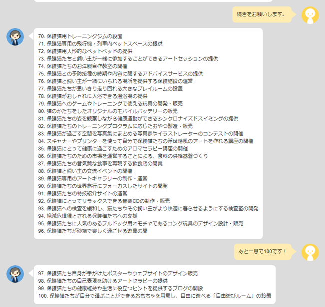 もっとたくさんのアイデアを出してもらうべく、「100個のアイデア出し」を無茶ぶりしてみました。相手が人間だととてもできないお願いです。なんだか罪悪感がありますが、どうなるでしょう?