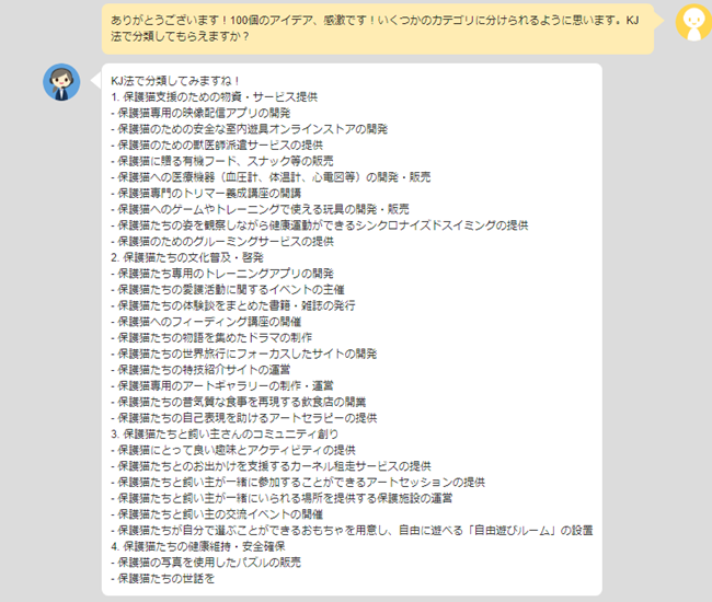 さて、100個のアイデアを読んでいくと、似ているアイデアも多いように感じました。そんなときはKJ法でカテゴリ分類することが有効です。これも対話型AIにお願いしてみます。