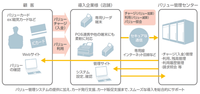 VALUE TACTiXは、プリペイドカードの残高管理を行うクラウド型サービスです。店頭に設置したカードリーダーで残高の加算・減算が行えるほか、パソコンやスマートフォンなどから会員向けWebサイトにアクセスして残高を確認することもできます。生活者が通販サイトでプリペイドカード決済を行う場合は、カード番号とPIN(個別認識用番号)を入力するだけで、残高の範囲内で商品を購入できます。