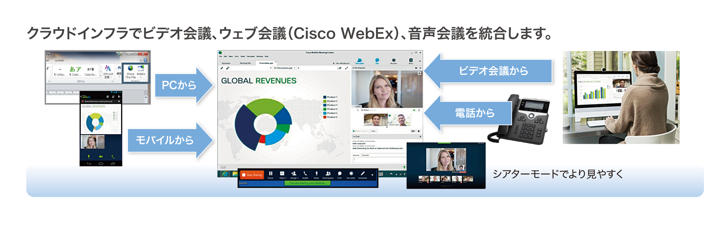 今回提供開始する「Cisco CMR Cloud」は、グローバルシェアNo.1のウェブ会議サービス「Cisco WebEx®」と「Cisco TelePresence®」を始めとした各種ビデオ会議製品、一般電話やIP電話などの音声会議を統合するクラウドソリューションです。利用者は、ビデオ会議の簡易さ、ウェブ会議の多機能さ、高品位な臨場感と電話の手軽さを、その時々の利用シーンに合わせ選択でき、より多彩なワークスタイルに対応することが可能となります。