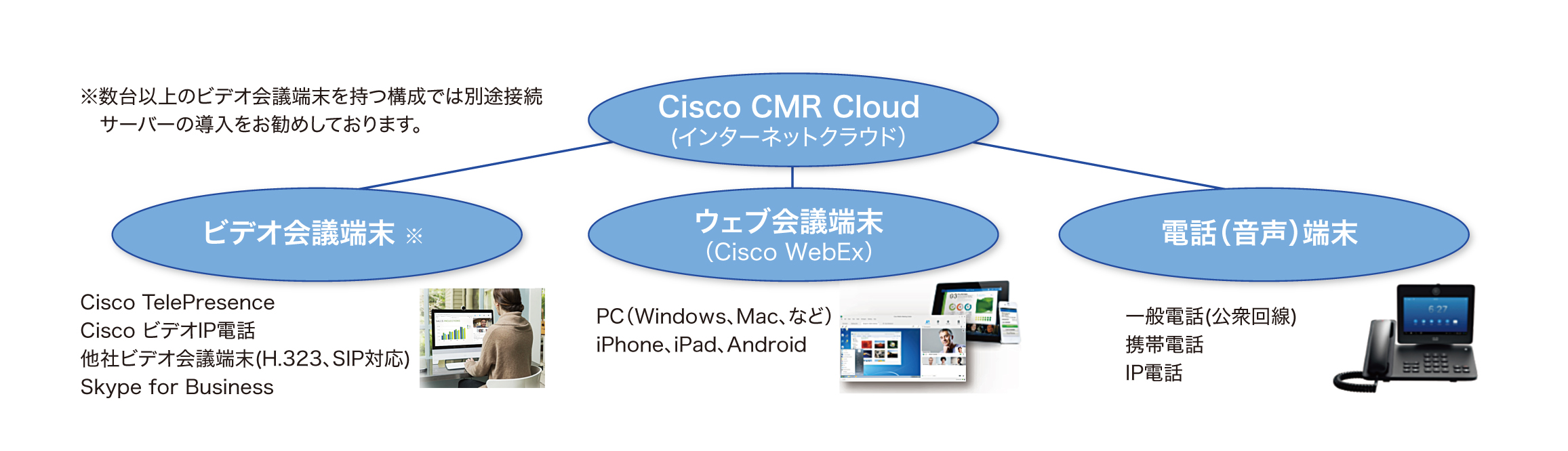 「Cisco CMR Cloud」は、クラウドソリューションであるため会議用の高価な機器の用意が不要です。また、小規模な環境から始められるため柔軟な導入が可能であり、会議用の設備を持つ必要が無く、ITインフラ運用コストの削減が見込まれます。 - 3多彩な端末に対応
