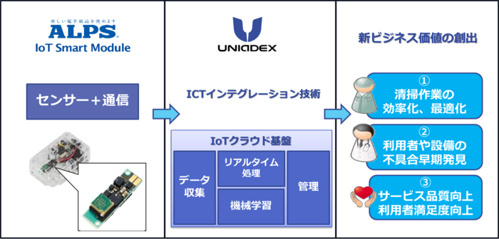 すでに、アルプス電気とユニアデックスは、スマートシティ利活用モデルの1つとして、センサーネットワークモジュールとICT基盤(データ収集・分析基盤、クラウド)を組み合わせた「個室トイレの利用」に関する実証実験を計画しています。今後は、製造業、ヘルスケア分野を中心に、少子高齢化・安全/セキュリティーをキーワードにした利活用モデルの抽出を行い、技術的な検証に向け準備を進め、2016年4月から、センサーネットワークモジュールを活用したユニアデックスのIoTソリューションサービスを順次提供の予定です。