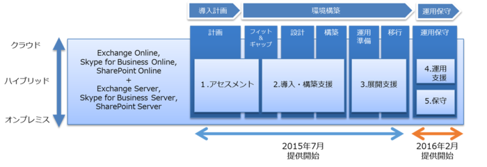 2015年7月に提供開始した「アセスメントサービス」、「導入・構築支援サービス」、「展開支援サービス」と、今回の「運用支援サービス」、「保守サービス」を合わせることにより、Office 365活用のアセスメントから運用支援・保守までの総合的なサービスを提供します。