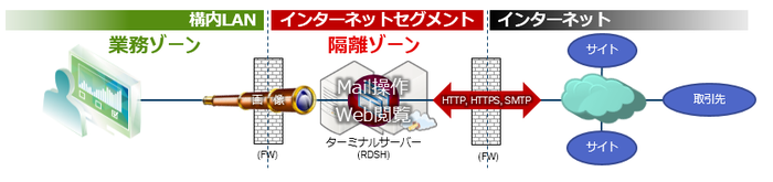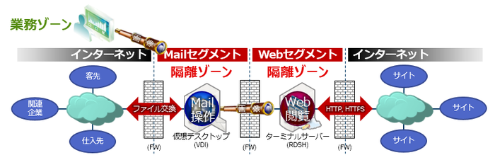 「インターネット分離」とは、仮想化技術とファイアーウォールを用いてネットワークをインターネットアクセス用と業務用に分離することです。両者間の通信は画面転送のみに限定するため、標的型攻撃や危険サイトへのアクセスによる、業務用ネットワーク側へのマルウエアの侵入を防ぐことができます。