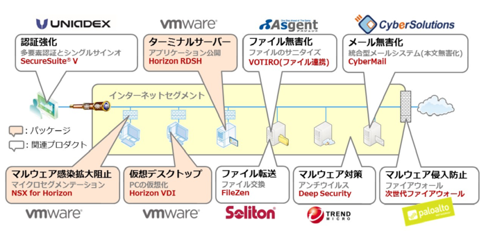 今回、ユニアデックスは、これらの実績とノウハウを集約した上で、最新の情報セキュリティー対策技術を盛り込んだ「自治体向けインターネット分離ソリューション」を、VMware®製品を中心とした製品群でパッケージ化しました。