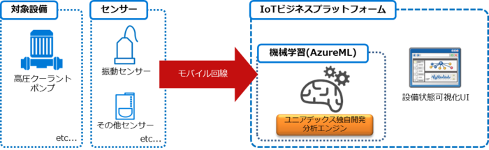 本実証実験では、センサーを用いて振動などのデータをモバイル回線経由で収集し、クラウド上にユニアデックスが独自に実装した稼働監視・設備診断サービスを用いて、設備の異常度を分析・表示します。本サービスに組み込まれている機械学習エンジンは、設備診断専門家の協力の下にユニアデックスが開発したものです。設備診断の複雑な分析結果を簡単な数値にして表示することで、設備診断の専門知識がなくても一定の診断を可能にします。