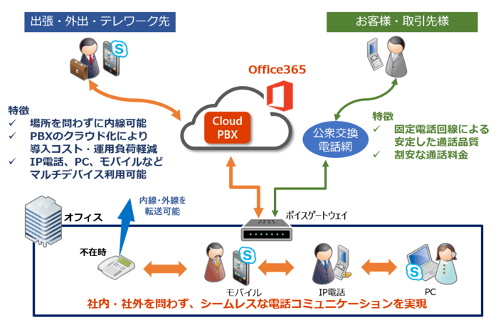 Cloud PBXにより、Office 365が従来から提供するコミュニケーション機能に、電話制御機能が1つに統合されることで、メール、電話、Web会議など多彩なコミュニケーション手段を、社内外の場所を問わずに、シームレスに利用可能になります。例えば、外出時や在宅勤務時にオフィス内のユーザーと内線番号で通話する、不在時にオフィス宛の電話を携帯電話やオフィス内の代理ユーザーへ転送する、海外出張時に割高なローミング費用を気にせずに、国内のオフィス内やお客さまと連絡をする、といったことが実現可能になります。
