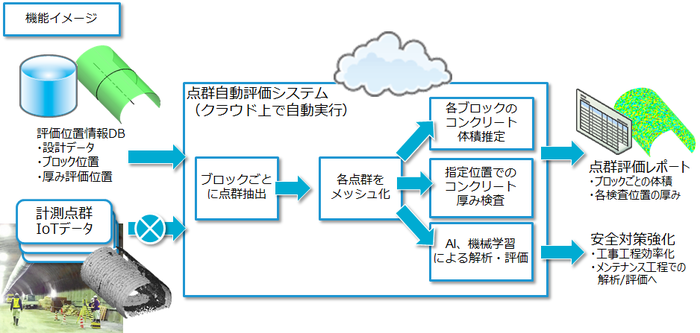 今回のシステムでは掘削壁面の内空の計測点群IoTデータから、仮設構造物・重機械などの関係のない不要点を、設計データを用いて効率よく除外します。また、本システムでは掘削壁面の測定だけでなく、覆工コンクリートの厚さ検査の自動化(国交省が推奨している出来形管理の試行要領(注2))や、補強のためのコンクリート体積自動計算をトンネルのブロックごとに積算できるため、トンネル壁面内へ正確なコンクリート量を供給することができます。さらに、作業員の作業負担も軽減されるため、安全で正確なトンネルの施行管理・検査業務が可能となります。