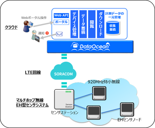 本トライアルキットでは、マルチホップ無線EH型センサシステムとユニアデックス株式会社(代表取締役社長:東 常夫、以下 ユニアデックス)が提供している「DataOcean®」によるクラウド機能、株式会社ソラコム(以下 ソラコム)が提供するLTE回線「SORACOM Air」をパッケージングして一括提供します。