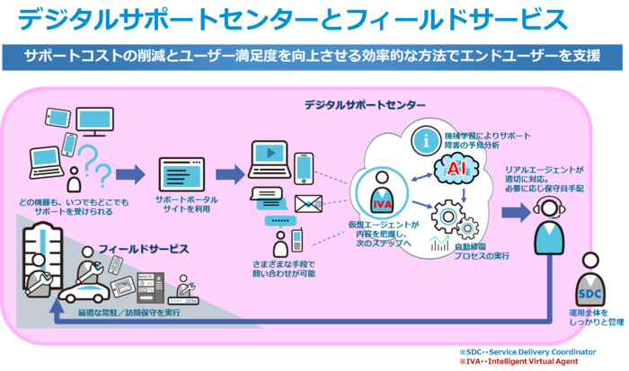 本サービスは、AIを活用した効率的なIT運用と強固なセキュリティーを兼ね備えた「デジタルサポートセンター」と、ARなどのデジタルツールと熟練された技術員の手による「フィールドエンジニアサービス」を組み合わせて提供します。さらに、ITIL(注)に準拠した本サービスを世界約100カ国に対し、ユニアデックスのサービスデリバリーコーディネーター(SDC)の一元管理の元、24時間365日提供します。