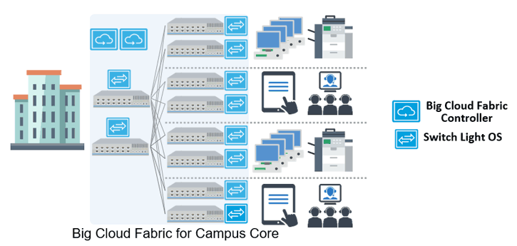 従来、両社はデータセンターネットワークにおけるシンプルな運用と迅速な対応を実現したSDN製品 「Big Cloud Fabric」 を提供してきました。このたび、主力機能・ライセンス形態はそのままにデータセンター向けの機能の一部を省略し、ビルや建物内のオフィスネットワーク向け「Big Cloud Fabric for Campus Core」を提供します。