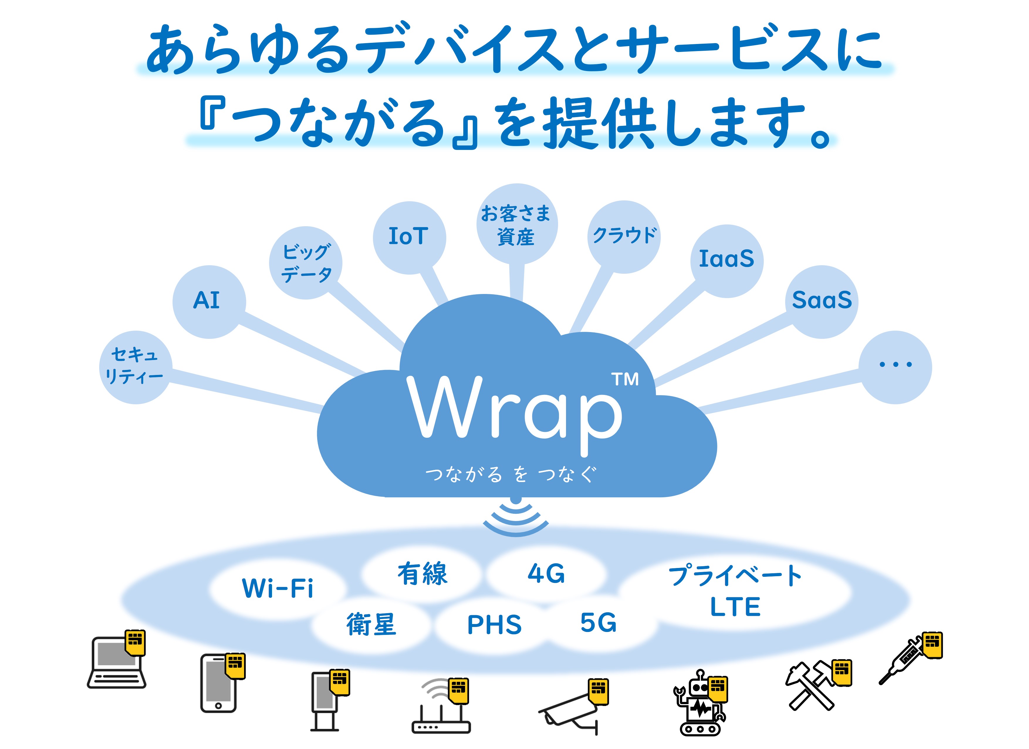 両社は本提携によるソリューションの第一弾として、クラウド型ネットワークサービス「Wrap™(ラップ)」の開発を進めています。 本サービスでは、LTE over IPによる仮想プライベートLTEを用い、社内ネットワークやインターネット上にある企業が管理すべきあらゆるデバイスを、セキュアかつ個別独立した形でユニアデックスのクラウドサービスに接続します。そのうえで、社内システムや各種クラウドサービスなどのアクセス先への経路制御や優先制御・プロトコル制限など、端末毎のEnd to End の通信制御のすべてをクラウド上で提供します。 これにより、複雑多様化する企業内ネットワークが持つさまざまな課題を解決しつつ、今後爆発的な普及が見込まれるIoTやロボットなどの新たなテクノロジーにも、柔軟に対応可能な企業内ネットワークを構築することが可能になります。