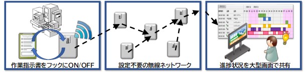 具体的には、各製造工程に「IoTデバイス付きのネットワーク装置」を設置します。作業員の作業状況をIoTデバイスのスイッチが「ON/OFF」されることで集約集計し、全ての作業進捗状況を大型画面で情報共有することができます。