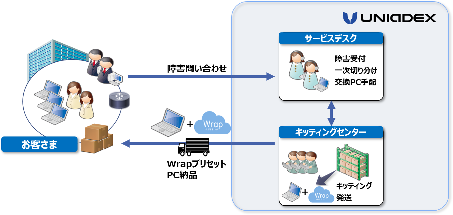 ユニアデックスは、煩雑なPC運用管理業務からお客さまを解放する「マルチデバイス運用サービス」に、テレワークソリューションを組み合わせたテレワークパッケージを6月1日から提供開始します。第一弾は、クラウド型ネットワークサービス「Wrap®」(注1)をセットで提供します。「Wrap」を利用可能なPCを提供することで、利用者はすぐに(注2)セキュアな環境でテレワークを開始することが可能です。加えて、故障時にはサポートサービスにより迅速にPCを交換でき、不明点はヘルプデスクが解決します。